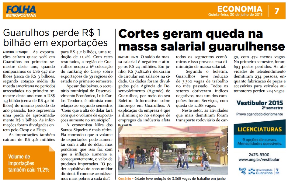 Principais jornais da Cidade repercutem os dados do Boletim Informativo do Emprego em junho de 2015 e no primeiro semestre do ano em Guarulhos.
