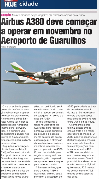 O maior avião do mundo, A380, pode começar a operar no Aeroporto de Guarulhos em novembro