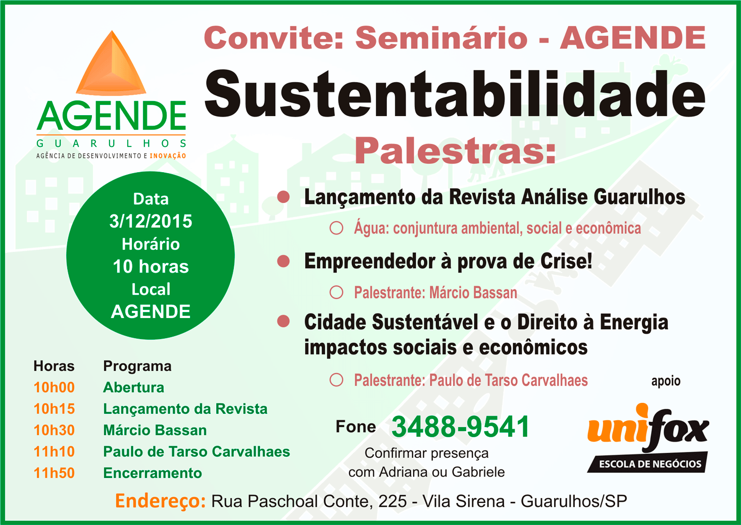 A AGENDE Guarulhos realizará em seu auditório, dia 3 de dezembro, às 10 horas, o Seminário Sustentabilidade que contará com o lançamento da Revista Análise Guarulhos com o tema Água e sua conjuntura ambiental, social e econômica. Também haverá duas palestras: a primeira será O Empreendedor à Prova de Crise! e a segunda sobre Cidade Sustentável e o Direito à Energia. O Seminário Sustentabilidade contará com a participação de associados e diretores da AGENDE, empresários, representantes e lideranças do poder público, de entidades de classe, da academia e da imprensa.